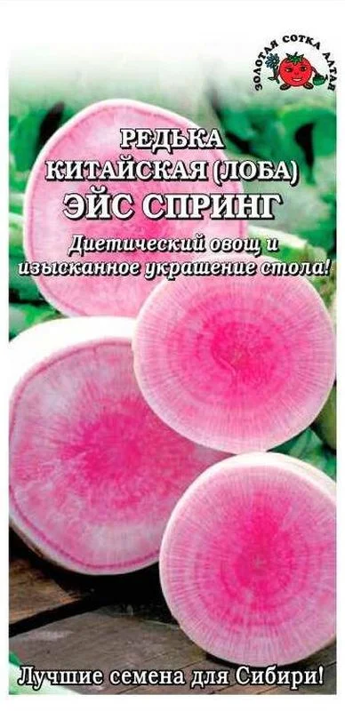 Диетический овощ–изысканное украшение стола! Сорт среднеранний. Период от полных всходов до начала хозяйственной годности 55-65 дней. Розетка листьев полупрямостоячая. Корнеплод удлиненно-эллиптический, верхняя часть зеленая, нижняя белая, массой 100-220 г. Мякоть красная, сочная, нежного слабоострого вкуса. Рекомендуется для использования в свежем виде и зимнего хранения.Растение неприхотливое, может расти на любых типах почв, но наибольшую урожайность дает на легких, плодородных. Выращивается безрассадным способом. Наилучшее время для посева – вторая половина июля. Семена высевают на глубину 1,5-2 см в борозды, расположенные друг от друга на расстоянии 30-40 см. Всходы появляются на 3-5 день. В фазе 2-3 листочков всходы прореживают, удаляя слабые сеянцы и оставляя расстояние 12-15 см. Дальнейший уход заключается в регулярных поливах, рыхлении и прополках. В фазе формирования корнеплода потребность в воде резко возрастает. В этот период поливать редьку нужно регулярно, а позже - только при долгом отсутствии дождей, при угрозе высыхания почвы. Уборку урожая проводят по мере созревания корнеплодов.