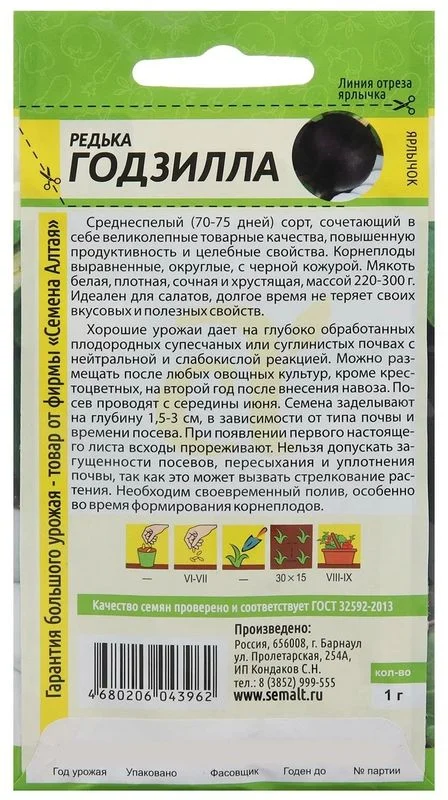 Среднеспелый (70-75 дней) сорт, сочетающий в себе великолепные товарные качества, повышенную продуктивность и целебные свойства. Корнеплоды выравненные, округлые, с черной кожурой. Мякоть белая, плотная, сочная и хрустящая, массой 220-300 г.Идеален для салатов, долгое время не теряет своих вкусовых и полезных свойств.