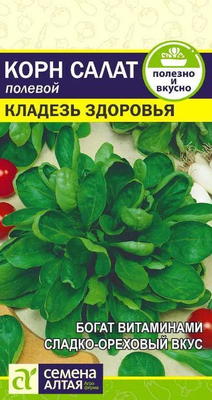 Раннеспелый сорт,период от всходов до уборки урожая 25-30 дней. Розетка листьев полупрямостоячая, высотой 7 см, диаметром 10 см, благодаря своей компактности подходит для выращивания в комнатных условиях на подоконнике. Листья среднего размера, обратнояйцевидные, темно-зеленые, гладкие. Масса растения 20 г. Зелень обладает очень нежной текстурой, тонким пряным ароматом и приятным сладковато-ореховым послевкусием. Корн салат содержит цинк, марганец, калий, витамины А, В и С. По содержанию фолиевой кислоты он превосходит все другие салаты. Нормализует обмен веществ, повышает уровень гемоглобина в крови, снижает отложение солей и стимулирует выведение холестерина из организма, помогает при ожирении и диабете. Употребляется в свежем виде, идеально сочетается с любыми овощами.
