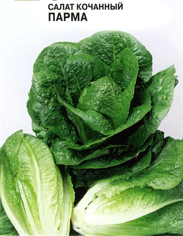 Салат Парма - среднеспелый сорт зеленого кочанного салата для выращивания в открытом грунте и в теплицах на салатных линиях. От высадки 20-и дневной рассады до технической спелости 45–55 дней. Розетка листьев приподнятая, высотой до 30 см, диаметром 15–20 см. Листья овально-удлиненные, темно-зеленые, со слабоволнистым, цельным краем. Кочан закрытый, удлиненный, без антоциановой окраски, консистенция ткани листьев полухрустящая. Масса одного растения 350–400 г. Вкус отличный. Долго сохраняет товарный вид. Салат Парма устойчив к цветушности и краевому ожогу листьев. Рекомендуется для выращивания в открытом грунте в течение всего лета, а также в защищенном грунте на салатных линиях. Семена коричневые, в 1 г в среднем 960 штук. Густота посадки 11–13 раст./м2, по схеме 25х25 см. Урожайность 3,8–4,8 кг/м2.