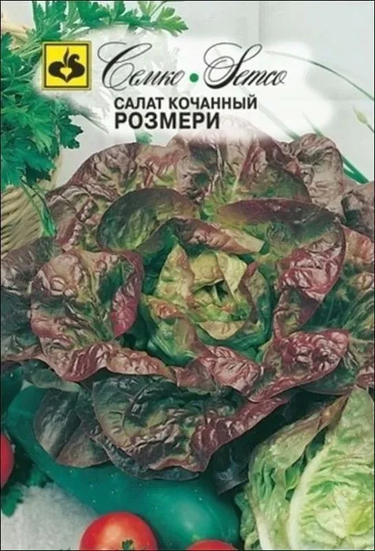 Салат Розмери - среднеранний сорт кочанного салата для выращивания в открытом и защищенном грунте грунте. От всходов до технической спелости 45–65 дней. Розетка листьев полуприподнятая, диаметром до 30 см. Лист крупный, маслянистый, пузырчатый, с цельным, волнистым краем. Кочан округлой формы, плотный, хорошо закрытый, среднего размера. Масса одного растения 240–280 г. Наружные листья красноватые средней интенсивности, с высоким содержанием антоциана. Вкусовые и товарные качества отличные. Высокая устойчивость к цветушности. Салат Розмери рекомендуется для выращивания в открытом грунте в течение всего сезона, в том числе прямым посевом, а также в защищенном грунте. Семена светло-серые, среднего размера, в 1 грамме содержится в среднем 1190 штук. Оптимальная схема посева 30х25 см. Густота посадки 12–13 растений на м2. Урожайность 2,9–3,6 кг/м2.