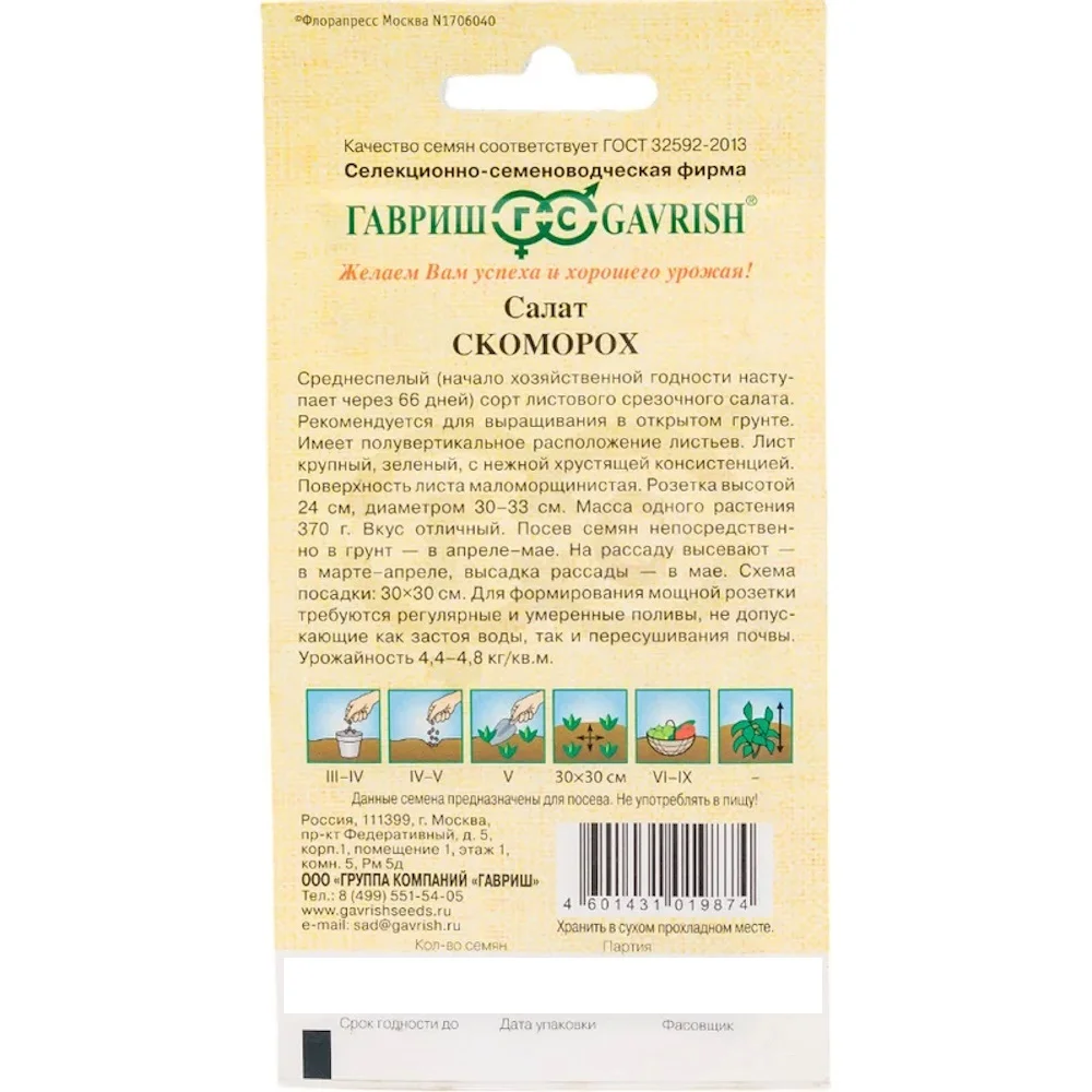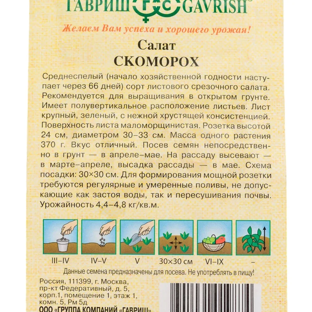 Среднеспелый (начало хозяйственной годности наступает через 66 дней) сорт листового срезочного салата. Рекомендуется для выращивания в открытом грунте. Имеет полувертикальное расположение листьев. Лист крупный, зеленый, с нежной хрустящей консистенцией листьев, маломорщинистой поверхностью. Розетка высотой 24 см, диаметром 30-33 см. Масса одного растения 370 г. Вкус отличный. Посев семян непосредственно в грунт в апреле - мае. На рассаду высевают в марте - апреле, высадка рассады – в мае. Схема посадки 30x30 см. Для формирования мощной розетки требуются регулярные и умеренные поливы, не допускающие как застоя воды, так и пересушивания почвы. Урожайность 4,4 - 4,8 кг/м2