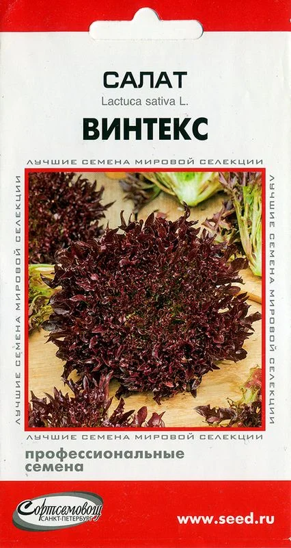 Новый тип салата -Salanova .Отличается компактностью и большим количеством листьев в, чем в обычных салатах. Винтекс - среднеранний (50-60 дн. от всх.) сорт листового  красного хрустящего (Фризе) салата.  Листовая розетка плотная, с объемной, сильнорассеченной структурой. Листья бордово-красные, у основания зеленые, сильнорассеченные (резные), хрустящие, сладкие,сочные. Ценность сорта:  хорошая сохранность после уборки в течение недели, отличные вкусовые качества, устойчивость к стрелкованию, великолепный товарный вид.