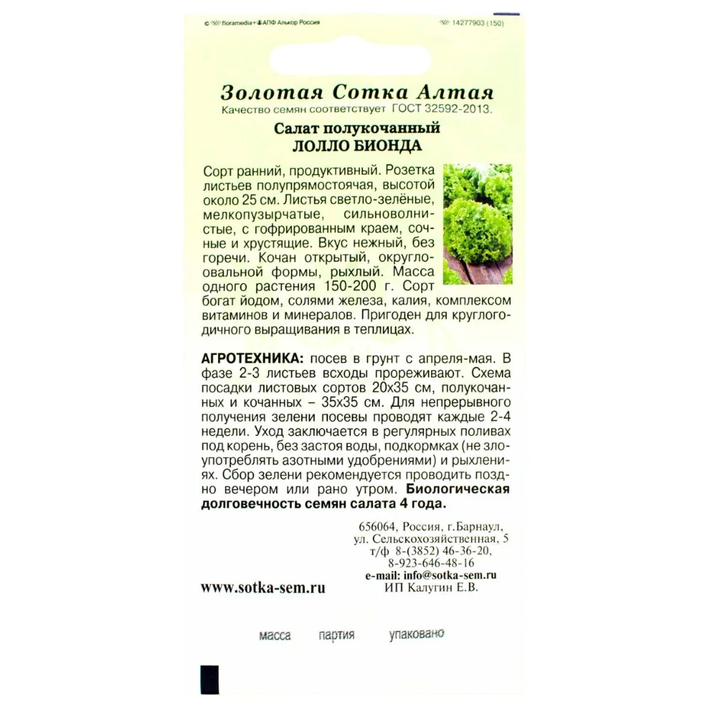 Раннеспелый (40-55 дней) сорт. Лист средний, кучерявый, зеленого цвета, хрустящий и нежный. Вкусовые качества отличные. Посев в открытый грунт апрель-август, схема посева 20 х 8-20 см, глубина посева 1-2 см. Период уборки май-сентябрь. Урожайность 3 кг/кв.м.