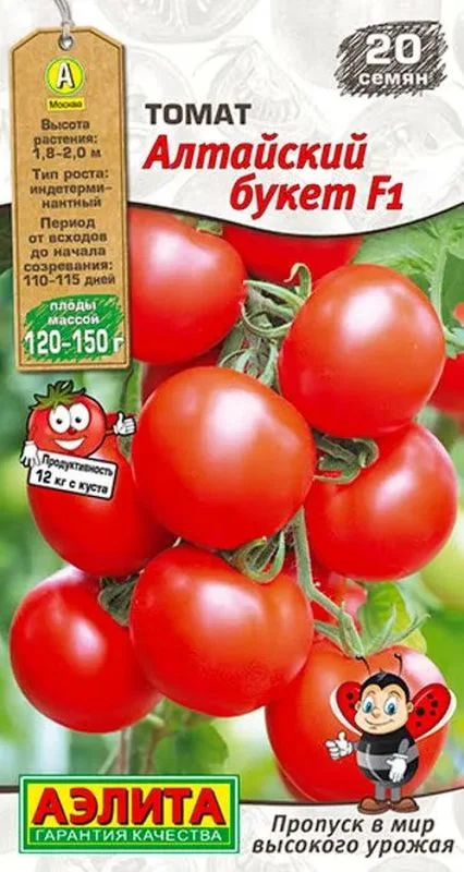 Гибрид Алтайский букет F1 – это букет преимуществ, которые так ценят садоводы. На крепком и мощном растении в теплице формируется до 10 кистей, на которых образуется 6-8 красивых плодов. Растение индетерминантное, раннего срока созревания – от всходов до сбора первых плодов 110-115 суток. Томаты выровнены по размеру и форме, очень плотные, 2-х камерные, без пустот, массой 120-150 г. Вкусовые качества отменные –очень сочные, с легкой кислинкой.У гибрида отличная завязываемость плодов, даже при перепаде ночных и дневных температур.В кулинарии подходит для всех видов переработок и употребления в свежем виде.Отличная продуктивность – 12 кг с 1 куста.