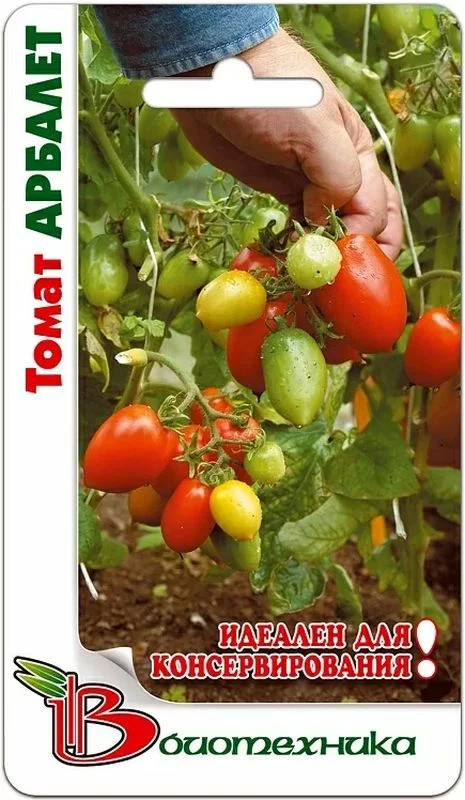 Томат Арбалет. Скороспелый (100-110 дней) от всходов до плодоношения, урожайный сорт для малогабаритных укрытий и пленочных теплиц. Растение полудетерминантное, нештамбовое,высотой 90-100 см,кисть простая.Плоды малиново-красные,овальные с небольшим носиком,длиной до 7 см,массой 50-60 г,мясистые,сладкие.