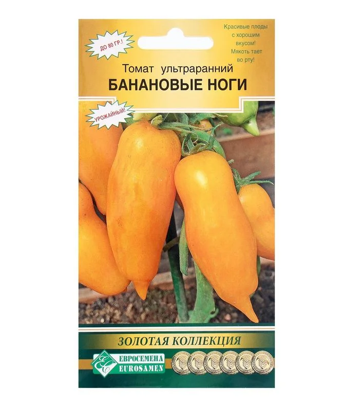 Ультраранний сорт с ограниченным ростом. Высота кустов не превышает 70-80 см. Листья и стебли тонкие, поэтому в одной лунке одновременно может выращиваться по 2 куста. Подходит для выращивания в открытом и закрытом грунте. Пасынкования не требует, но для получения более раннего урожая рекомендуется выщипывать все побеги до первой цветочной кисти.Отличительная особенность сорта – низкая кислотность плодов, придающая приятное сладковатое послевкусие. Помидоры банановые ноги благодаря плотной кожице идеальны для засолки и цельноплодного консервирования. Из достоинств сорта можно отметить следующие: высокие показатели урожайности; нетребовательность к условиям выращивания; высокие вкусовые характеристики томатов; возможность возделывания безрассадным методом.
