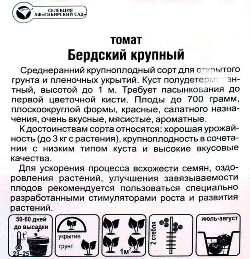 Среднеранний крупноплодный сорт для открытого грунта и пленочных укрытий. Куст полудетерминантный, высотой до 1м.