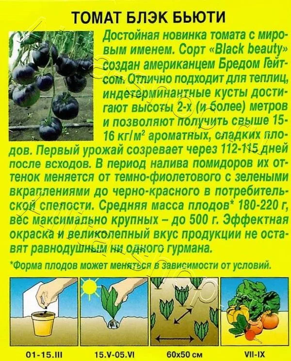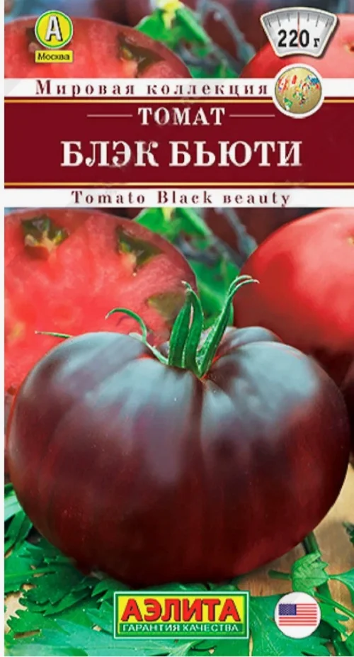 Достойная новинка томата с мировым именем. Сорт «Black beauty» создан американцем Бредом Гейтсом. Отлично подходит для теплиц, индетерминантные кусты достигают высоты 2-х (и более) метров и позволяют получить свыше 15-16 кг/ м 2 ароматных, сладких плодов. Первый урожай созревает через 112-115 дней после всходов. В период налива помидоров их оттенок меняется от темно-фиолетового с зелеными вкраплениями до черно-красного в потребительской спелости. Средняя масса плодов* 180-220 г, вес максимально крупных – до 500 г. Эффектная окраска и великолепный вкус продукции не оставят равнодушным ни одного гурмана.