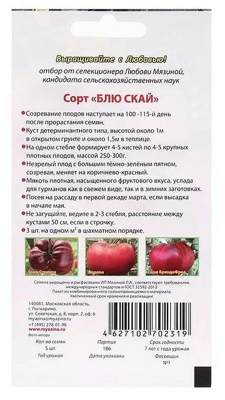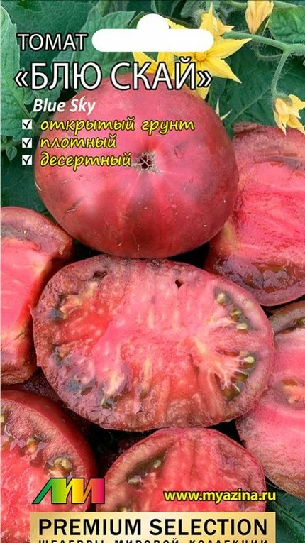 Среднеспелый, созревание плодов наступает на 115-120-й день после прорастания семян. Урожайный сорт, дающий с квадратного метра по двадцать килограммов среднеплодных томатов. В кисти созревает 6-8 плодов, на растении одновременно может сформироваться до восьми кистей. Куст детерминантного типа. Вырастает высотой 70-80 сантиметров в открытом грунте и до полутора метров в тепличных условиях. Растение требует подвязки и выборочного пасынкования. Формировка куста ведется в два — три ствола для теплиц и в два – для открытого грунта. Плоды сорта Блю скай (Голубые небеса) необычайные.Это экзотический и эксклюзивный сорт, выращивать который мечтают многие дачники. Томаты имеют форму плоско-округлого типа, крупные, плотные, весить могут от 300 до 500-600 граммов. В стадии зрелости начинают причудливо окрашиваться в радужный спектр, который включает фиолетовый, лиловый, синий и темно-синий, красный и розовый оттенки. Вся это «радуга на грядке» имеет очень хороший вкус. Мякоть темно-вишневая, сахаристая, тает во рту. Плоды сочные, фруктово-цветочного аромата. Сорт пригоден для свежего потребления и консервации. Устойчив к болезням. Рассаду сеют за 60-65 суток до высадки саженцев в грунт. Размещение на квадратном метре – четыре — пять растений.