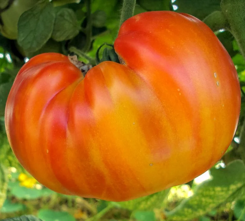 Индетерминантный, среднеспелый, крупноплодный биколор с неплохой завязываемостью. Формируйте в один-два стебля. В норме, в каждой из 6-7 кистей образуются по 3-4 плоскоокруглых плода. Плоды крупные, средней массой 350 г, до 600 г, зрелые - с красно-жёлтыми широкими мазками на боковых поверхностях, с аппетитным мраморным поперечным срезом и замечательным фруктовым вкусом. Так как завязь нижних кистей переключает поток пластических веществ только на себя, напомню, что для крупноплодных сортов регулярные подкормки с микроэлементами важны, они обеспечивают завязь на верхних кистях. Посев на рассаду в первой декаде марта, проращивать, как и все крупноплодные при повышенной температуре 28-29*С.
