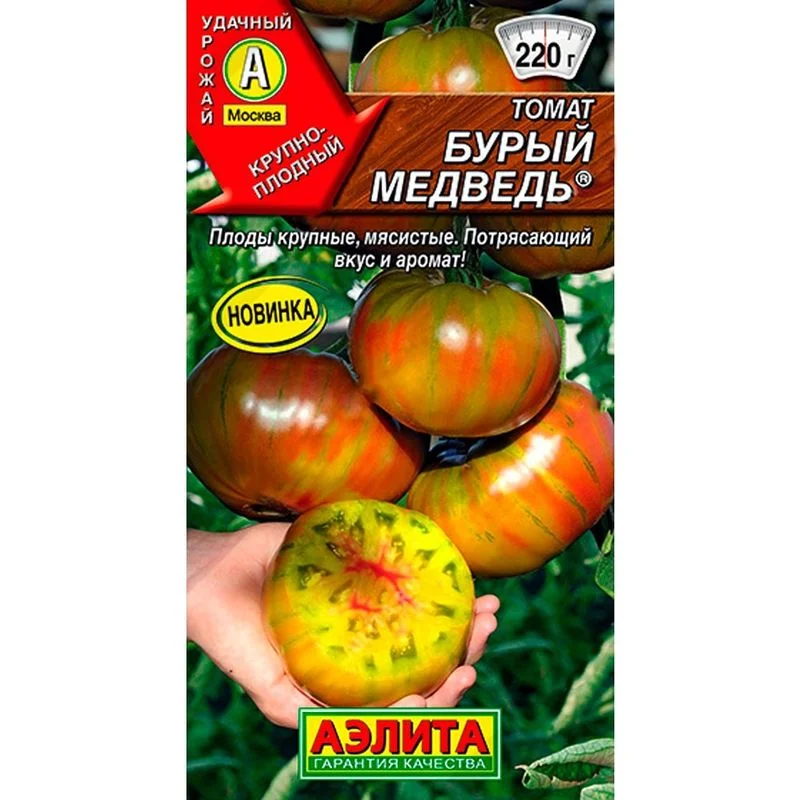 Впечатляющий экзотический сорт томата! Среднеспелый, от полных всходов до начала созревания – 105-110 дней. Растение индетерминантное, подходит для выращивания в защищенном и открытом грунте. Плоды крупные, плоскоокруглой формы, массой 160-220 г (встречаются экземпляры до 400 г). Спелый томат отличается оливково-зеленой кожицей, на которой возможны розовые и коричневые пятна. Мякоть сочная и сладкая, розово-зеленого цвета. Наш томат Бурый медведь® станет украшением любого блюда или салата, а прекрасный вкус окончательно располагает к себе сердца садоводов. Сорт толерантен к болезням. Урожай 9-10 кг/м2 .Сеянцы пикируют в фазе одного-двух настоящих листьев. Растения подвязывают и формируют в 1- стебля. Обязательным является удаление боковых побегов (пасынков).