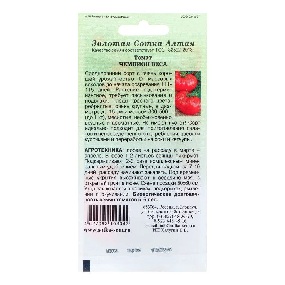 Среднеранний, очень урожайный сорт. Период от массовых всходов до начала созревания 111-115 дней. Растение индетерминантное, требует пасынкования и подвязки. Плоды красные, ребристые, очень крупные, в диаметре до 15 см и массой 300-500 г (до 1 кг), мясистые, сладкие и необыкновенно вкусные. Не имеют пустот! Сорт идеально подходит для приготовления салатов, соков, засолки кусочками и переработки.