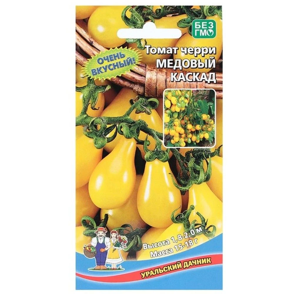 Раннеспелый, высокоурожайный, индетерминантный сорт, который является разновидностью черри. Плоды–ярко-желтые маленькие помидорки массой 20-30 г, растущие до 15 шт. на одной кисти. Плоды грушевидной формы также напоминают капельку, при этом свисают массивными каскадами, что и определило название сорта. А приставка «медовый» в названии обусловлена необычайно сладким для помидоров вкусом — считается, что этот сорт — самый сладкий среди всех томатов.Мимо этих томатов пройти невозможно. Они привлекают внимание своей грушевидной формой, а когда спеют – напоминают яркие электрические лампочки и «Медовый каскад» особенно любят дети, потому что томаты напоминают им игрушки! Как упоминалось, плоды «Медового каскада» очень сладкие на вкус, поэтому многие хозяйки варят из них варенье. Очень эстетично небольшие желтые грушевидные томаты смотрятся законсервированными в банках.