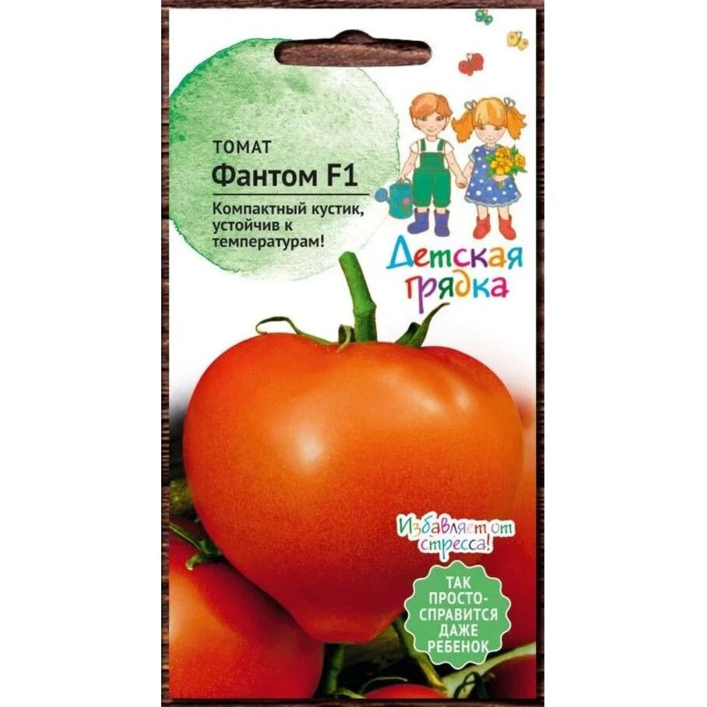 Ранний индетерминантный гибрид томата (80-90 дней от всходов до начала созревания). Рекомендуется для выращивания в первом и втором обороте пленочных теплиц, в открытом грунте. Корневая система мощная, активная. Растение сбалансированное, вегетативного типа. Лист от среднего до крупного, темно-зеленый, расположение пониклое. Первое соцветие закладывается над 7-9 листом, последующие через 1-2 листа. Соцветия простые и промежуточного типа с 6-10-ю плодами. Плоды округлые «с носиком» (индекс формы плода 0,9-1,0), прочные, устойчивые к растрескиванию. В стадии технической спелости зеленые (без пятна), в стадии биологической спелости красные. Средняя масса плода 170-200 г. Отличная транспортабельность и высокие вкусовые качества плодов. Гибрид высокоустойчив к вирусу мозаики томата, вертицилезу, фузариозному увяданию и кладоспориозу, среднеустойчив к бактериальной пятнистости.Для получения более насыщенной окраски плода рекомендуется применять повышенные дозы калийных удобрений. Высокий уровень засоленности почвенного раствора также может влиять на интенсивность окраски плодов гибрида Фантом F1. Рекомендован для выращивания в открытом и защищенном грунте. Агротехника: Культура требовательна к теплу, предпочитает хорошо окультуренные плодородные почвы. На рассаду семена высевают в конце марта – начале апреля. Пикировка в фазе 1-2 настоящих листьев. Высадка рассады в грунт в возрасте 55-70 дней, когда минует угроза заморозков. Схема посадки 50×40 см. Уход заключается в своевременных прополках, пасынковании и поливе. В течение вегетации обязательно проводят 2-3 подкормки.