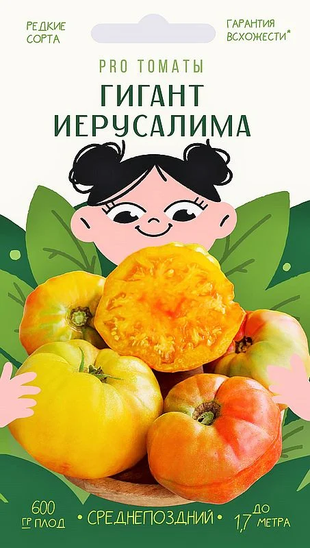 Особенность сорта: довольно редкий красивый и вкусный салатный томат три-колор. Плоды довольно крупные, ярко-оранжевые с малиновыми пятнами румянца, на разрезе такие же многоцветные, очень мясистые. На вкус - фруктовый сахар! Описание: у сорта Гигант Иерусалима или Jeruzalemes Gigant`s (англ.) - очень крепкий куст, соответственно его можно выращивать в несколько стеблей и получать высокие урожаи с малой площади. Плоды лучше срывать, не допуская перезревания, когда они еще достаточно плотные, не потерявшие структуру. Тогда во вкусе присутствует фруктовая нотка. Многокамерная мякоть, мясистая, сладкая, сочная и ароматная. При полном созревании плоды практически целиком розовые, массой до 700 гр, а внутри сохраняется розово-желтая мраморность. Плодоносит до заморозков. Требователен к солнцу.