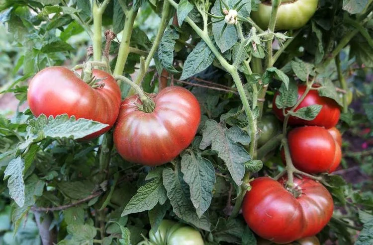 Куст невысокий, лист темно-зеленого цвета, "картофельный" морщинистый, крупный. Плоды плоскоокруглые, массой 200-400г. Темно-коричнево-бордовые снаружи, насыщенно малиновые внутри, приятного освежающего вкуса.