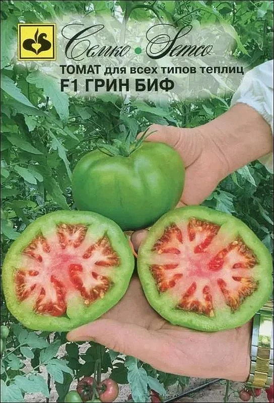 Томат Грин Биф F1 - среднеранний, индетерминантный гибрид для защищенного грунта. От всходов до полного созревания (красный цвет плодов) 115-120 дней, а до первых сборов зелёных плодов с краснеющей мякотью 100-105 дней. Растение генеративного типа, мощное, с укороченными междоузлиями. Первое соцветие закладывается над 7-9 листом. В кисти 3-4 плода. Помидор плоскоокруглый, с большими чашелистиками, ребристый, многогнёздный, плотный, насыщенно-красного цвета, массой 220-250 г, лёжкий. Созревание плода начинается изнутри, первые сборы начинаются в момент лёгкого покраснения в районе пестичного рубца или у основания плода. В этой стадии вкусовые качества плодов самые насыщенные, с необычной кислинкой и продолжительным послевкусием. Томат Грин Биф F1 устойчив к вирусу томатной мозаики (ToMV), вирусу жёлтого скручивания листьев (TYLCV), фузариозному (Fol 1-2) и вертициллёзному (Va, Vd) увяданию, кладоспориозу (Ff) и нематодам (Ma, Mi).Используется для свежего потребления. Схема посадки 70х40 см. Урожайность свыше 30 кг/м2.