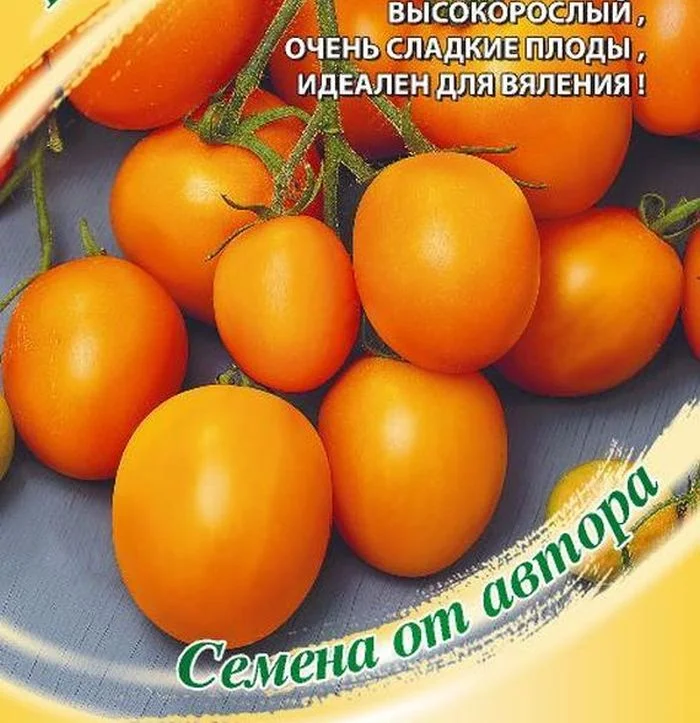 Среднеспелый урожайный сорт. Растение высокорослое с длительным периодом плодоношения для выращивания в теплицах и пленочных укрытиях и открытом грунте (южные регионы). Спелые плоды округло-сливовидной формы, ярко-оранжевого окраса массой до 30 г, в кисти содержится от 10 и более штук. Вкус у черри-томатов очень сладкий с изумительным фруктовым ароматом. Отлично подходит для вяления, употребления в свежем виде, приготовления ярких, летних салатов, соусов, консервирования и замораживания. Посев на рассаду проводят в начале марта. Пикировка — в фазе первого настоящего листа. Высадку рассады в теплицы — в мае по схеме 40х60 см. Через несколько дней после высадки растения формируют в 2-3 стебля, удаляют все «пасынки» и подвязывают к опоре. Устойчив к основным болезням томата. Семена после уборки сохраняют всхожесть в течение 10 лет при оптимальных условиях хранения. Рекомендуется увеличить норму высева по окончании срока годности.