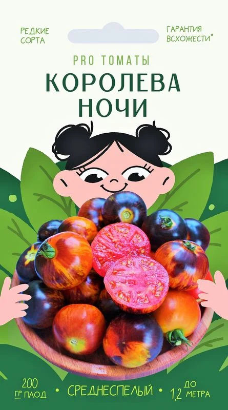 Особенность сорта: сорт Королева ночи – не что иное, как произведение искусства. Экзотический томат - один из самых красивых синеплодных сортов! Неимоверно яркая расцветка: на оранжево-красном фоне фиолетовые мазки и штрихи. Родиной происхождения этого сорта является Германия, поэтому его оригинальное название Koenigin der Nacht (нем.), нередко можно встретить и другое наименование - Queen of the Night (англ). Действительно, в этом томате собраны самые красивые королевские краски! Мякоть сочная, сладкая, красно-малинового цвета в разрезе. Используется для свежих салатов, приготовления и украшения блюд, реже для консервирования. Неприхотливый урожайный сорт плодоносит до заморозков, устойчив к заболеваниям и жаре. Любители экзотики не останутся равнодушными перед этим чудом селекции!