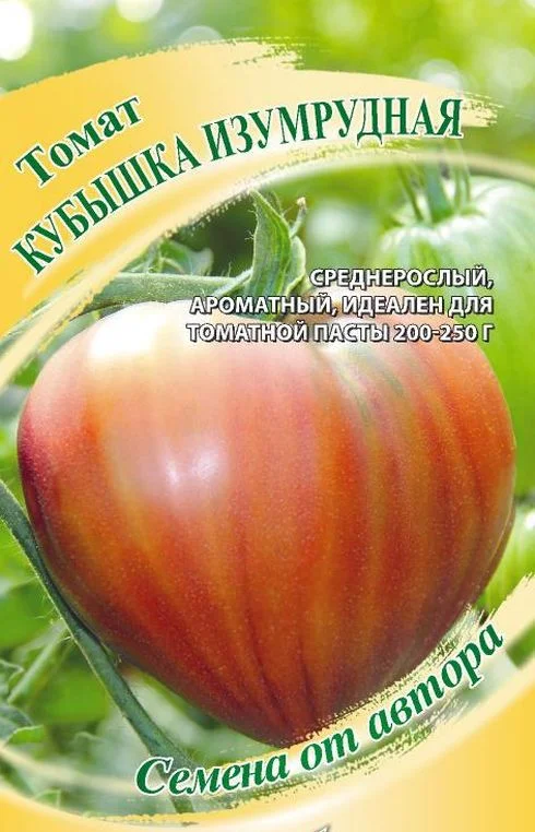 Среднеспелый (100-115 дней от всходов до созревания) сорт.Растение среднерослое (до 160 см) для теплиц, пленочных укрытий и открытого грунта (южные регионы) с обязательной подвязкой к опоре. Сердцевидные плоды, крупные 200-250 г, мясистые, сладкие, ароматные. В кисти содержится 3-5 штук. При созревании изумрудный окрас томатов меняется на буровато-розовый. Рекомендуются для употребления в свежем виде, ярких овощных салатов, томатных соков, паст, кетчупов, различных соусов. Посев на рассаду проводят в марте. Пикировка — в фазе первого настоящего листа. Высадка рассады в теплицы — в начале-середине мая в возрасте 40-45 дней (если апрель теплый, то высадка рассады возможна в конце апреля). Формируют в один стебель, удаляя все «пасынки». В конце вегетации прищипывают точку роста. Семена после уборки сохраняют всхожесть в течение 10 лет при оптимальных условиях хранения. Рекомендуется увеличить норму высева по окончании срока годности.