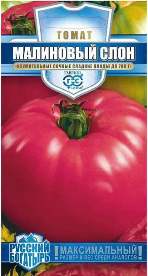 Среднеспелый (113-117 дней от всходов до плодоношения) крупноплодный томат для выращивания в открытом грунте (в южных регионах с подвязкой к кольям) и под пленочными укрытиями. Растение индетерминантное, высотой более 2 м. В кисти образуется до 6 сочных аппетитных плодов массой 400-500 г, часто до 700 г. Плоды плоско-округлой формы, слабо-ребристые, малиново - розовые, с нежной сахарной мякотью и изумительным ароматом. Прекрасный салатный сорт, подходит для консервирования кусочками, в сочетании с сортами Сибирский гигант и Оранжевый слон получаются очень яркие и вкусные овощные нарезки. Выращивают рассадным способом. Пикировку производят в фазе первого настоящего листа. После высадки растений в теплицу, растения подвязывают к опоре. Формируют в один стебель, удаляя все «пасынки» и нижние листья, а также прищипывают точку роста в конце вегетации. Схема посадки: 40х60 см. Плоды собирают по мере созревания.