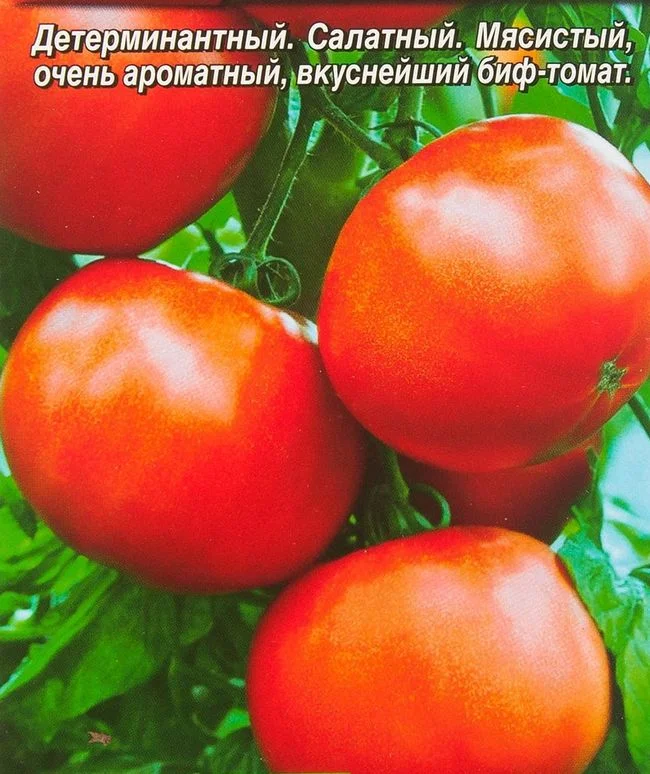 Крупноплодный биф-томат. Среднеспелый сорт для открытого грунта и пленочных теплиц. От всходов до плодоношения 111-115 дней. Растения детерминантные, высотой около 1 м. Средняя масса плода 200-300 г. При нормировании завязей вес плода достигает 500 г. Томаты мясистые, ароматные, очень вкусные. Отлично подходят для получения сока, пасты и соуса. Сорванные зелеными, быстро дозревают при комнатной температуре. Сорт хорошо переносит жару и засуху, устойчив к основным болезням культуры. Урожайность 9-12 кг/м2.В фазе 1-2 настоящих листьев сеянцы пикируют. Растения формируют в 1-2 стебля и подвязывают, чтобы не падали под тяжестью урожая.