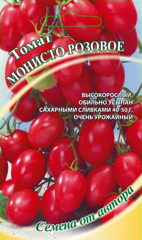 Характерная особенность сортов группы Монисто это невероятно обильное и дружное плодоношение. В эту пору растение очень декоративно — на высокорослом кусте в огромных разветвленных кистях созревают более 50 сахарных сливовидных плодов.  Растение индетерминантное (с неограниченным ростом), рекомендуется для теплиц и пленочных укрытий, возможно выращивание в открытом грунте с подвязкой к кольям (южные регионы). Плоды массой 40-50 г, розовые, сладкие и ароматные, созревают на растении через 110-120 дней после появления всходов. Отличный сорт для приготовления ярких свежих салатов, аппетитных закусок и разноцветных консервированных ассорти с сортами Монисто янтарное, изумрудное и шоколадное. Посев на рассаду — в марте. Пикировка — в фазе первого настоящего листа. Высадка в теплицы — в мае. Формируют в один стебель, удаляя все «пасынки».