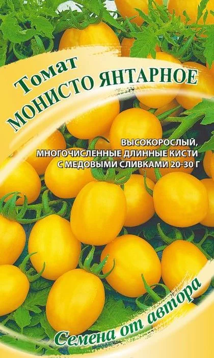 Характерная особенность сортов группы Монисто — это невероятно обильное и дружное плодоношение. В эту пору растение очень декоративно — небольшие сахарные сливки в многочисленных длинных кистях по 14-16 плодов плотно покрывают высокорослый куст. Растение индетерминантное (с неограниченным ростом), рекомендуется для теплиц и пленочных укрытий, возможно выращивание в открытом грунте с подвязкой к кольям (южные регионы). Плоды массой 20-30 г, желто-оранжевые, медовые, ароматные, созревают на растении через 110–115 дней после появления всходов. Отличный сорт для приготовления ярких свежих салатов, аппетитных закусок и разноцветных консервированных ассорти с сортами Монисто янтарное, изумрудное и шоколадное. Посев на рассаду — в марте. Пикировка — в фазе первого настоящего листа. Высадка в теплицы — в мае. Формируют в один стебель, удаляя все «пасынки». Семена после уборки сохраняют всхожесть в течение 10 лет при оптимальных условиях хранения. Рекомендуется увеличить норму высева по окончании срока годности.
