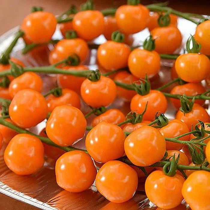 Великолепный сладкий десертный вкус ярких блестящих плодов. Индетерминантный раннеспелый гибрид для выращивания в открытом и защищенном грунте. Период от всходов до начала созревания 95-100 дней. Растение высокорослое, нуждается в подвязке и формировании в 1-2 стебля, отлично завязывает плоды в стрессовых условиях. Плоды округлые, гладкие, ярко-оранжевые, блестящие выравненные по форме и размеру собраны в простую, двустороннюю кисть по 15-25 штук, устойчивы к осыпанию, необыкновенно сладкие, десертного вкуса, массой 10-12 г. Имеет устойчивость к вирусным болезням, кладоспориозу, фузариозному увяданию. Миниатюрные плоды идеальны для свежих салатов и ярких маринадов.