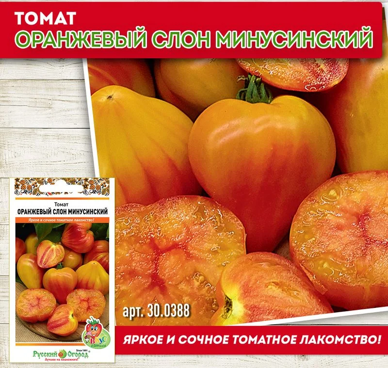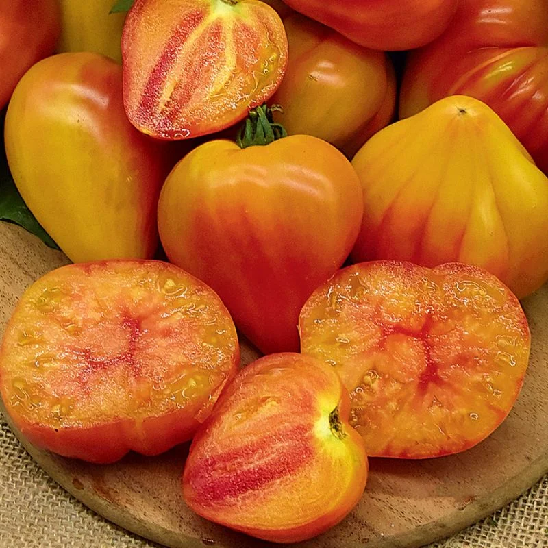 Коллекционный крупноплодный среднеспелый салатный сорт. Растение высотой до 1,8 м, индетерминантное. Плоды массой 200-400 г не только вкусны, но и очень красивы. Сердцевидные, чуть вытянутые, с характерным «носиком». Очень яркие: оранжево-жёлтые со светящимися розово-алыми вертикальными полосами. Мякоть сочная и плотная, на разрезе оранжевая с красно-розовыми разводами. Настоящий «живой мрамор»! Вкус отличный, деликатесный! Действительно сладкий, сбалансированный, с лёгкой кислинкой и нежным фруктовым послевкусием.