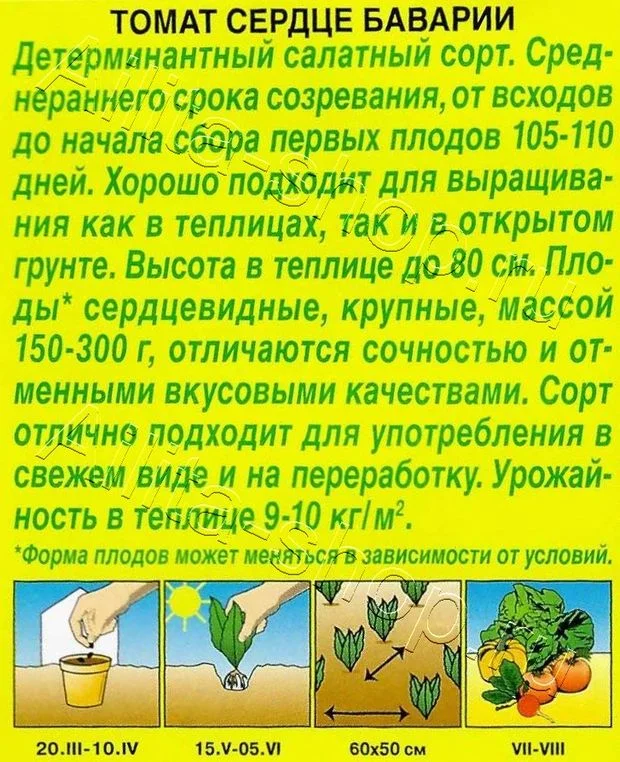 Детерминантный салатный сорт.Среднераннего срока созревания, от всходов до начала сбора первых плодов 105-110 дней.Хорошо подходит для выращивания как в теплицах, так и в открытом грунте.Высота в теплице до 80 см.Плоды сердцевидные, крупные, массой 150-300 г, отличаются сочностью и отменными вкусовыми качествами. Сорт отлично подходит для употребления в свежем виде и на переработку.Урожайность в теплице 9-10 кг/ м2.Форма плодов может меняться в зависимости от условий.В фазе 1-2 настоящих листьев сеянцы пикируют. Растения формируют в 1 стебель (или в 2). В открытом грунте не пасынкуют.При выращивании в теплице своевременно удаляют все пасынки (при достижении ими длины не более 3-5 см) до первой кисти. Удалять нижние листья необходимо при созревании плодов во второй кисти.