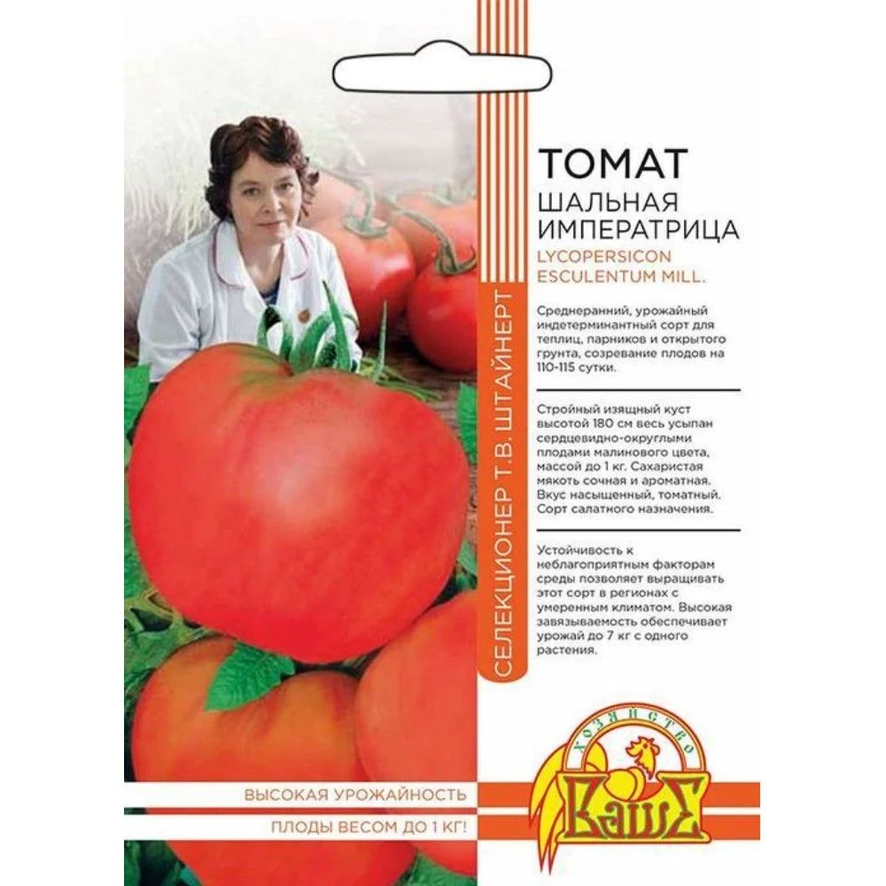 Тихой поступью пришла Шальная императрица в томатное королевство. Родом с Южного Урала, величавая и грациозная она гордо восседает на троне популярности среди своих фаворитов – герцогов, кардиналов, лордов и маршалов. Они склонились перед ней в почтительном поклоне, понимая, что нет равных этому совершенству. Изысканные формы божественно-сладких плодов-«сердец» розового цвета с малиновым оттенком соблазняют распробовать их тут же, с кисти, не отходя от грядки. По королевскому регламенту они начинают созревать на 110-115 сутки. Тонкий, по-женски слабый, но выносливый стебель достигает 180 см в теплице и 100 см в открытом грунте, требующий подвязки, он едва справляется с невероятной нагрузкой. И откуда только силы берутся? На одном растении может вырасти до 7 кг! Плоды достигают веса в 1 кг при хорошем уходе. Зернистая на изломе мякоть, как будто посыпана сахаром, сочная и ароматная. Кожура тонкая, семян мало.