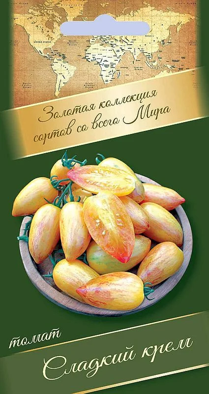Очередной шедевр селекции Брэда Гейтса, США. Яркие, сочные, необычной формы, очень сладкие! Кистевой сорт с устойчивостью к перепадам температур. Сладкий крем - говорящее за себя название. Действительно очень сладкий, с небольшим количеством кислинки, которая делает вкус идеальным. Плоды - сливки с острым носиком, полосатые, очень блестящие, вначале кремовые, затем ярко желтые с красными полосами. Куст выглядит как фейерверк! Это очень высокорослый сорт - до 2 м в теплице, среднеранний и очень урожайный. Выращивать в 2-3 ствола.