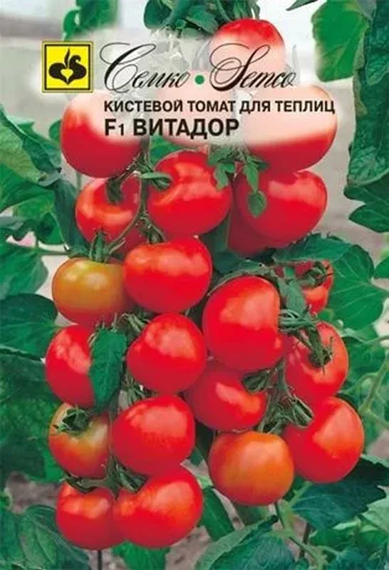 Томат Витадор F1 - среднеранний, индетерминантный кистевой гибрид. От всходов до созревания 95-100 дней. Растение сильнорослое. Первое соцветие закладывается над 7-9 листом, последующие – через 2-3 листа, в кисти 6-8 плодов. Плод округлый, массой 100-130 г. Окраска незрелого плода зелёная, зрелого – насыщенно красная. Вкусовые качества плодов отличные. Томат Витадор F1 хорошо завязывает плоды при любых погодных условиях. Гибрид устойчив к растрескиванию, одновременное созревание плодов позволяет проводить уборку плодов кистями, длительность хранения в кисти (до 40 дней). Транспортабельность плодов отличная. Витадор F1 устойчив к вирусу томатной мозаики (ToMV), вирусу бронзовости (TSWV), желтого скручивания листьев (TYLSV), вертициллёзу (Va,Vd), фузариозу (Fol), фузариозной гнили корней (For). Рекомендуется для выращивания во всех типах теплиц. Схема посадки 70х30 см. Урожайность св. 30 кг/м2.