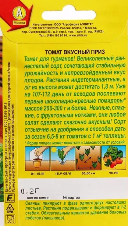 Томат для гурманов! Великолепный раннеспелый сорт, сочетающий стабильную урожайность и непревзойденный вкус плодов. Растения индетерминантные, в з/г их высота может достигать 1,8 м.Уже на 107-112 день от всходов поспевают первые шоколадно-красные помидоры массой 200-300 г и более. Нежные, сладкие, с фруктовыми нотками, они любой салат сделают сказочно вкусным! Сорт отзывчив на удобрения и способен дать за сезон 6,5-8 кг томатов с 1 м2 теплицы.Форма плодов может меняться в зависимости от условий.Сеянцы пикируют в фазе одного-двух настоящих листьев.Растения подвязывают и формируют в 1-2 стебля. Обязательным является удаление боковых побегов (пасынков).