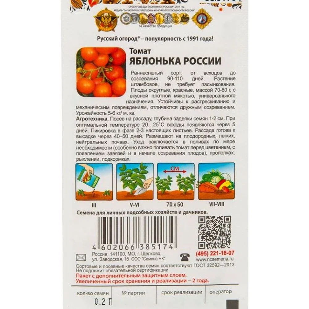 Знаменитый отечественный сорт с плодами идеальной формы – томат Яблонька России. Купить семена в розничной продаже непросто, ввиду их востребованности, но в «Русском Огороде» заказать их можно круглогодично. Растение позволяет экономить место в парнике или на огороде, так как характеризуется низкими кустами (до 80 см), высаживать которые можно довольно плотно, до 3-5 штук на квадратный метр. Форма помидор почти совершенная, круглая, цвет яркий, кожура плотная, размер небольшой – до 80 грамм. Это оптимальное решение для консервации, томаты хорошо помещаются в банки. Куст штамбовый, в подвязке и пасынковании не нуждается. Созревание раннее – всего 90 – 110 дней. Урожайность не менее 3 кг с одного растения.