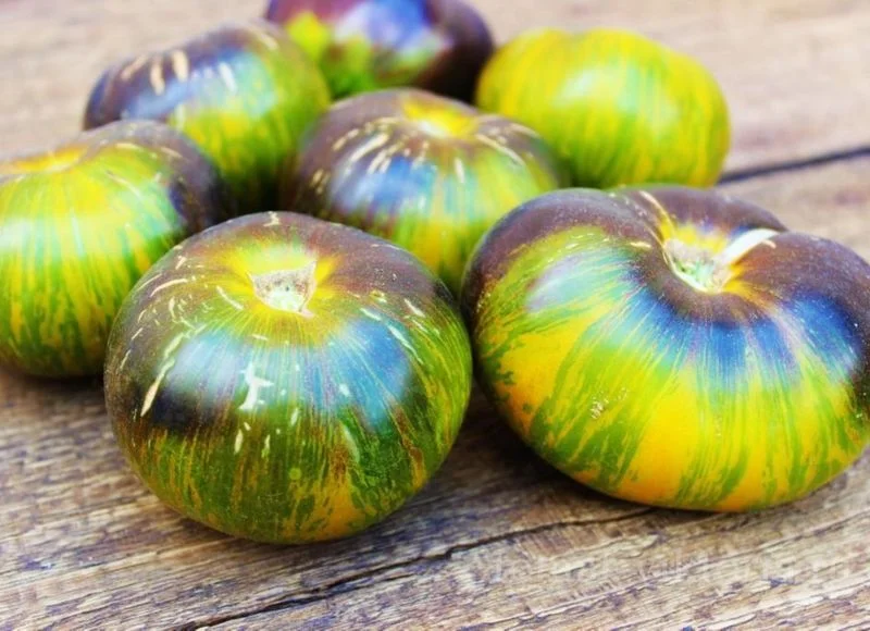 Плоды томата имеют неповторимый внешний вид. Зрелые плоды имеют светло-зеленую окраску с темно-зелеными штрихами и полосками, а также фиолетовыми плечиками. Форма плода – плоскоокруглая. Масса каждого плода составляет от 90 до 150 граммов.