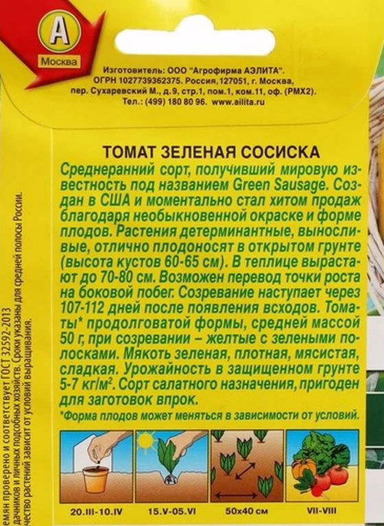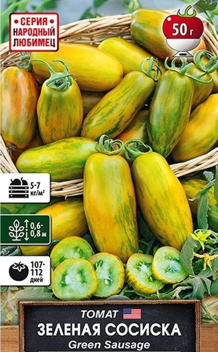 Среднеранний сорт, получивший мировую известность под названием Green Sausage.Создан в США и моментально стал хитом продаж благодаря необыкновенной окраске и форме плодов.Растения детерминантные, выносливые, отлично плодоносят в открытом грунте (высота кустов 60-65 см). В теплице вырастают до 70-80 см. Возможен перевод точки роста на боковой побег.Созревание наступает через 107-112 дней после появления всходов. Томаты продолговатой формы, средней массой 50 г, при созревании – желтые с зелеными полосками.Мякоть зеленая, плотная, мясистая, сладкая. Урожайность в защищенном грунте 5-7 кг/м2. Сорт салатного назначения, пригоден для заготовок впрок.