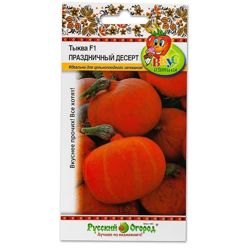 Тыква Праздничный Десерт F1 – верх кулинарного наслаждения! Плоды данного сорта понравятся всем хозяйкам за их исключительный вкус. Плоды красивого ярко-оранжевого цвета, имеют идеальный размер, весят 900-1000 г каждый. Такие плоды считаются порционными, они отлично подходят для запекания целиком в духовке или микроволновой печи. Еще одно их достоинство – очень нежный вкус, просто магический! Плоды сочные и хрустящие, мякоть очень сладкая, имеет характерный ореховый привкус.