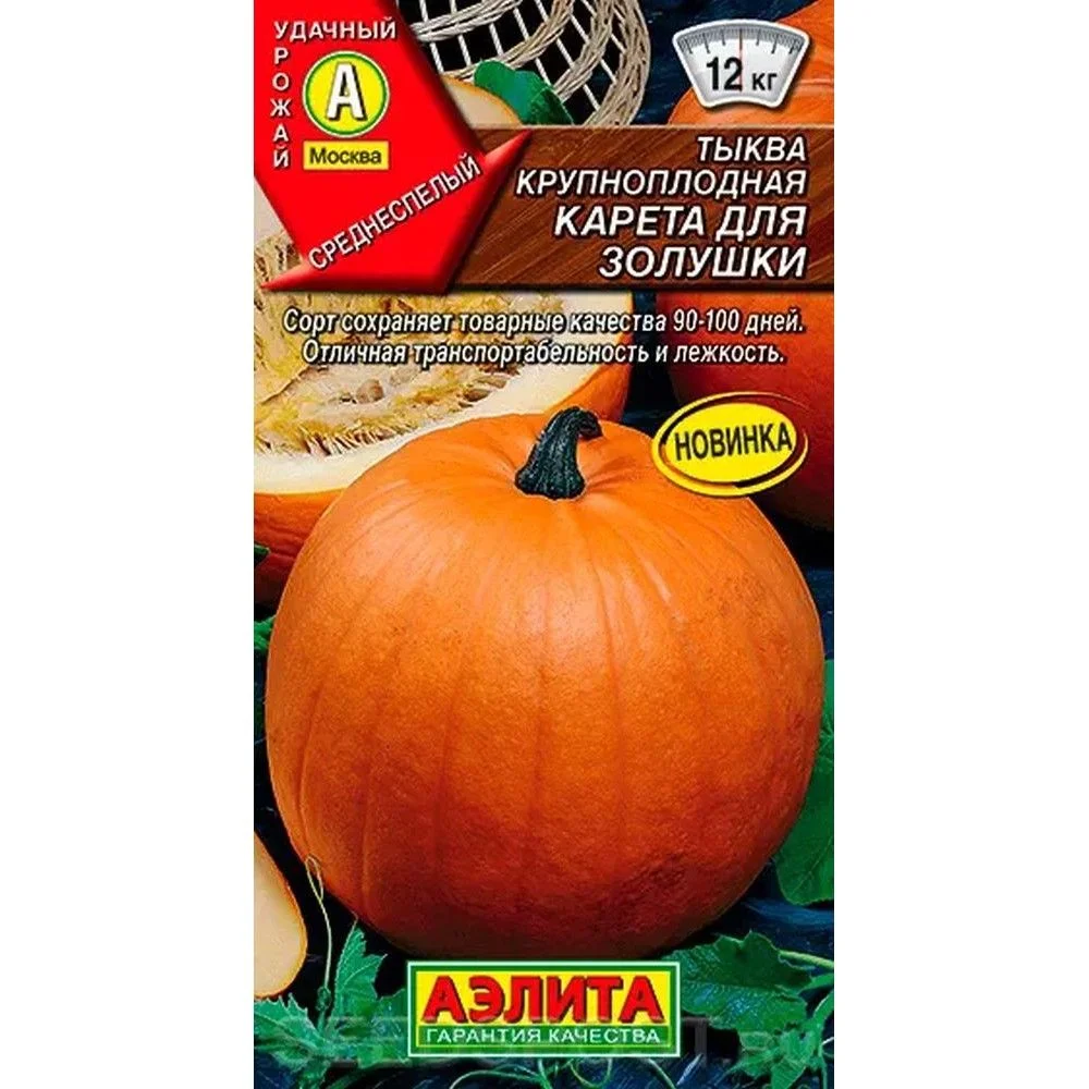 Среднеспелый сорт крупноплодной тыквы.Собирать с грядок урожай можно через 110-115 дней. Растения мощные, длинноплетистые. Плоды массой 8-12 кг, ярко-оранжевого цвета, достигают 30-40 см в диаметре. Красивая округлая форма тыквы идеально подходит для карвинга (резьба по овощам). Мякоть плотная и толстая, но при этом сладкая и сочная. Сорт можно с успехом использовать для приготовления каш, супов, сока и десертов.Плоды отлично транспортируются и хранятся, сохраняя товарные качества 90-100 дней.При образовании 3-4 листьев растения окучивают влажной почвой для образования придаточных корней.При слабом завязывании плодов при плохой погоде проводят искусственное опыление. Для усиления роста плодов их число на растении ограничивают до 3-4 шт.Точку роста прищипывают, оставляя над завязями 5-7 листьев.