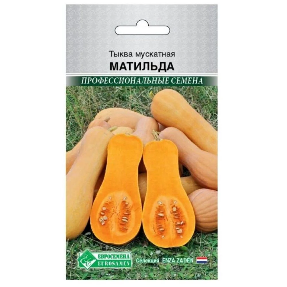 «Матильда»- среднеранний сорт мускатной тыквы для приготовления различных блюд: каш, супов и запеканок, а также для вкусных начинок в выпечках. Плоды слабо сегментированы, светло-желтые, грушевидной и цилиндрической формы. Кожура не толстая, плоды не грубые, легко разрезаются ножом. Мякоть плотная, отличается нежным вкусом, окрашена в оранжевый оттенок, запах характерно тыквенный с долькой арбузного аромата. У сорта небольшая семенная камера, расположенная в нижней части плода, количество семян незначительное.