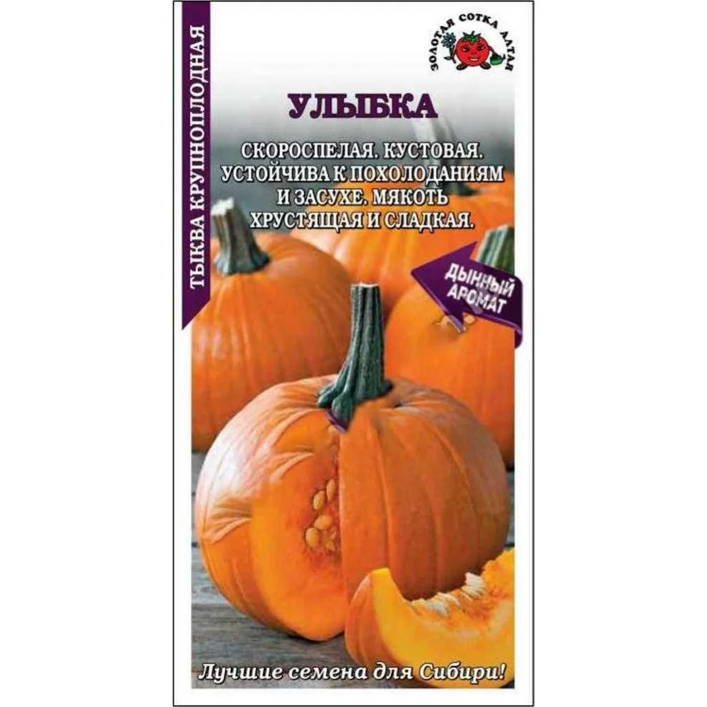 Новый ультраскороспелый лежкий сорт. Период от полных всходов до уборки 85 дней. Растение кустовое образует до 6 коротких побегов. На одном растении одновременно формируется до 7 плодов массой 0,5-1 кг. Плод шаровидный слегка сплюснутый слабо сегментированный. Кора средней толщины, мякоть ярко-оранжевая, сладкая, с дынным ароматом пригодна для свежего потребления и переработки. Сорт отличается повышенной холодостойкостью. Урожайность от 4-х до 9 кг с растения. Ценность сорта - ультраскороспелость в сочетании с лежкостью, высокие вкусовые качества, урожайность.Посев: семенами в грунт, когда почва прогреется до 10-12°С. высевают по 2-3 семени в лунку на глубину 3-5 см. После появления всходов слабые растения удаляют. Также выращивают через рассаду, с высадкой в открытый грунт в месячном возрасте, когда минует угроза заморозков. Схема посадки 80x80 см. Предпочитает супесчаные и легкосуглинистые почвы (чаще всего тыкву высаживают на компостные кучи).Уход: прищипка боковых плетей, прищипка главного стебля (после завязывания нескольких плодов), полив, прополка, рыхление, легкое окучивание (для лучшего образования придаточных корней) и обязательная подкормка.