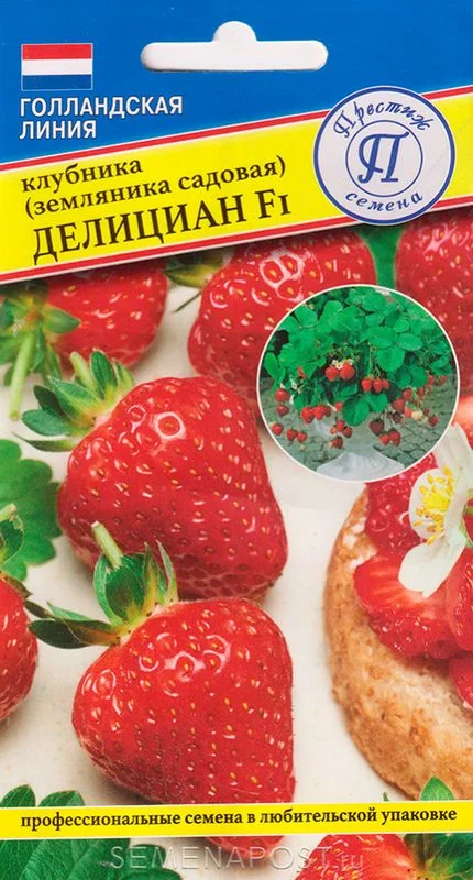 Делициан- высокоурожайный гибрид крупноплодной земляники (клубники) нейтрального дня созревания с длительным и обильным плодоношением, настоящая изюминка для истинных гурманов. Ягоды конической формы крупного размера, плотные, очень сочные и сладкие. Сорт очень ароматный, плодоносит до начала заморозков.  Делициан дает мощные усы с крупными цветоносами, что позволяет использовать его в ампельной культуре. Можно выращивать в домашних условиях в зимний период. Посев земляники производят в марте-апреле. Семена равномерно распределяют по увлажненной ровной поверхности. Всходы появляются в течение 30 дней. В фазе 1-2 настоящих листьев саженцы пикируют в горшочки. После появления 6 настоящих листьев высаживают в грунт с расстоянием между рядами 25-30 см, между растениями 15-20 см. Сбор урожая начинают с июля.Прекрасно подойдут для свежих десертов, домашних заготовок, заморозки, не теряют товарных качеств  при транспортировке.
