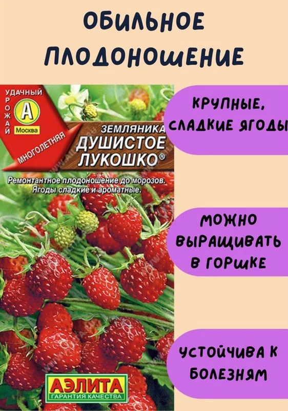 Ремонтантный, зимостойкий сорт мелкоплодной земляники. Кусты безусые, компактные, сомкнутые, высотой 20-25 см. Ягоды продолговатые, значительнее крупнее лесной земляники, массой 4-5 г. Очень вкусные, сладкие, сочные, с ярким земляничным ароматом. Плодоношение обильное и длительное, с июня до поздней осени. Выращивают рассадным способом.Посев семян возможен с февраля по июль. Семена сеют поверхностно на увлажненную и слегка уплотненную почву без заделки. Сверху накрывают стеклом или пленкой до появления массовых всходов. В фазе 1-2 настоящих листьев сеянцы пикируют в горшочки. Посадку в грунт проводят в фазе 5-6 настоящих листьев. Растениям необходимы регулярные поливы, прополки, рыхления и подкормки.