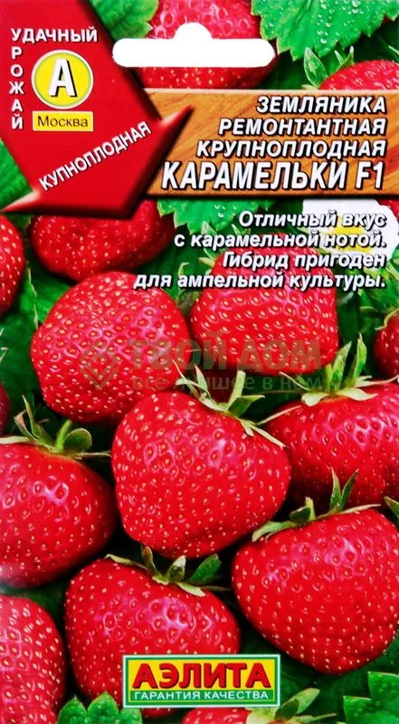 Крупноплодный ремонтантный гибрид. Формирует кусты высотой 25-30 см, непрерывно плодоносящие с июня до устойчивых заморозков. Образует усы, которые сразу начинают цвести. Растения отличаются высокой продуктивностью – уже в год посева дают 30-50 ароматных ягод с куста. Ягоды плотные, до 3 см в диаметре, вкус с карамельной нотой. Гибрид можно выращивать в горшечной культуре. Растения декоративны в подвесных емкостях.