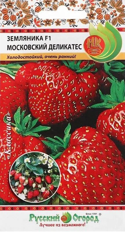 Это интенсивный гибрид земляники, который созревает на две недели раньше, чем другие сорта. «Московский деликатес F1» считается промышленным сортом, так как обладает повышенной продуктивностью и силой роста. Ягоды вырастают крупные, отличного вкусового качества, достигают массы 20-35 г. Консистенция плода плотная, мякоть сочная. Собирать урожай в открытом грунте можно до конца сентября. За сезон получают 1-1,5 кг отличных ягод с одного растения.