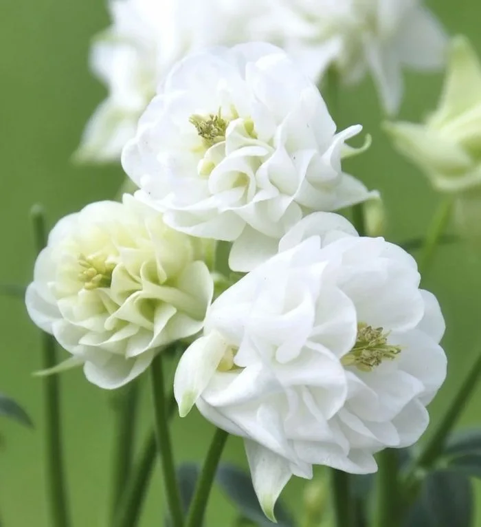 Аквилегия Винки Махровая белая – это необычные для аквилегии очень пышные цветки, лепестки которых имеют широкую овальную форму. Лепестков, кажется так много, что они формируют похожее на кружево соцветие, очень лёгкое и необычное. Центральная часть цветов – жёлтые яркие пыльники. Сорт Винки Махровая белая выровнен по высоте, а также цветение его очень пышное, плотное.