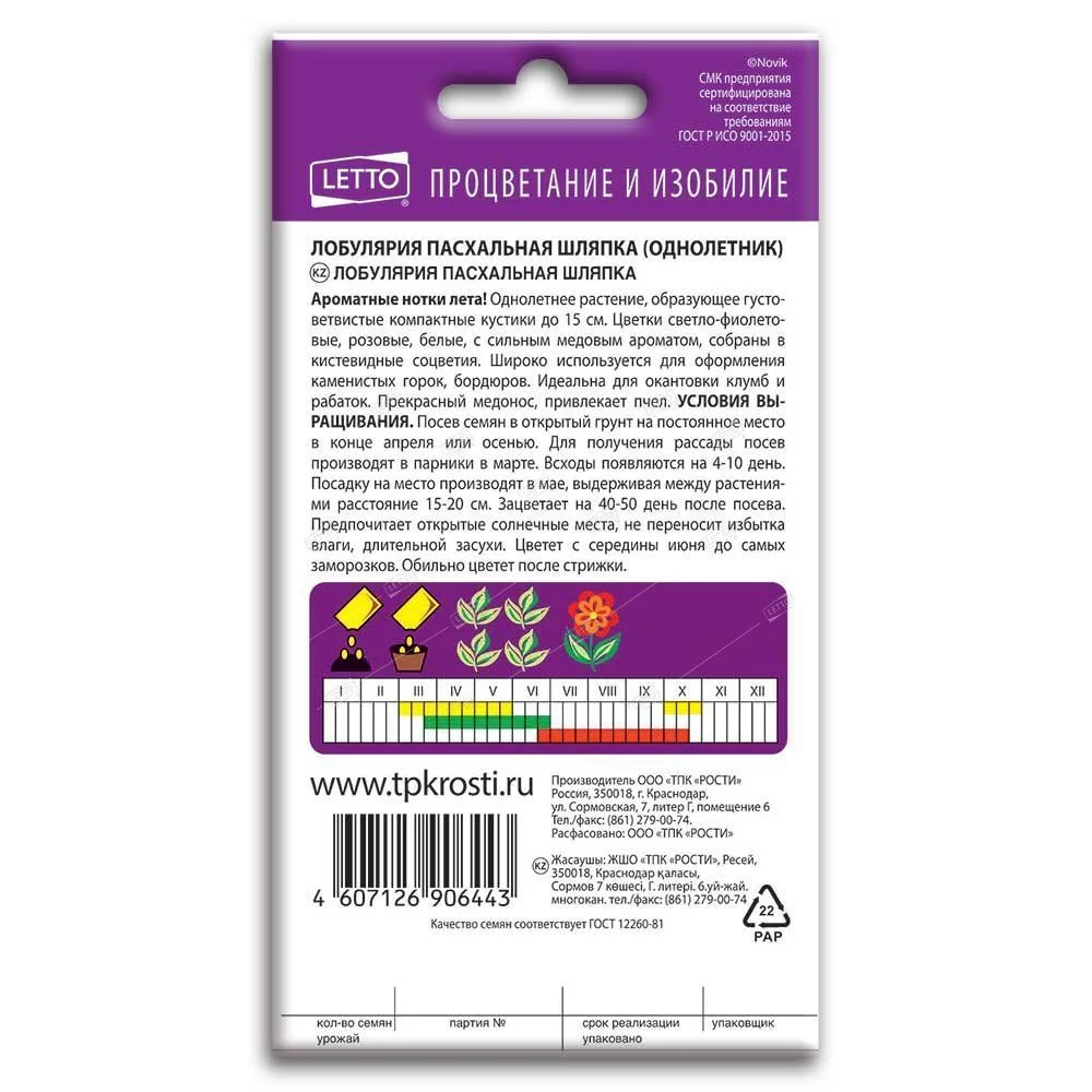 Ароматные нотки лета! Однолетнее растение, образующее густоветвистые компактные кустики до 15 см. Цветки светло-фиолето-вые, розовые, белые с сильным медовым ароматом, собраны в кистевидные соцветия. Широко используется для оформления каменистых горок, бордюров. Идеальна для окантовки клумб и рабаток. Прекрасный медонос, привлекает пчел. Посев семян в открытый грунт на постоянное место в конце апреля или осенью. Для получения рассады посев производят в парники в марте. Всходы появляются на 4-10 день. Посадку на место производят в мае, выдерживая между растениями расстояние 15-20 см. Зацветает на 40-50 день после посева. Предпочитает открытые солнечные места, не переносит избытка влаги, длительной засухи. Цветет с середины июня до самых заморозков. Обильно цветет после стрижки.
