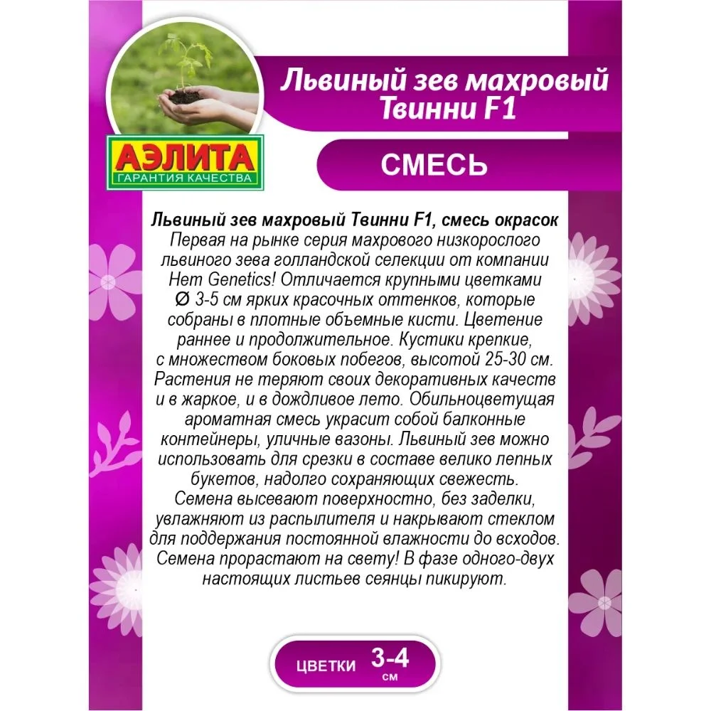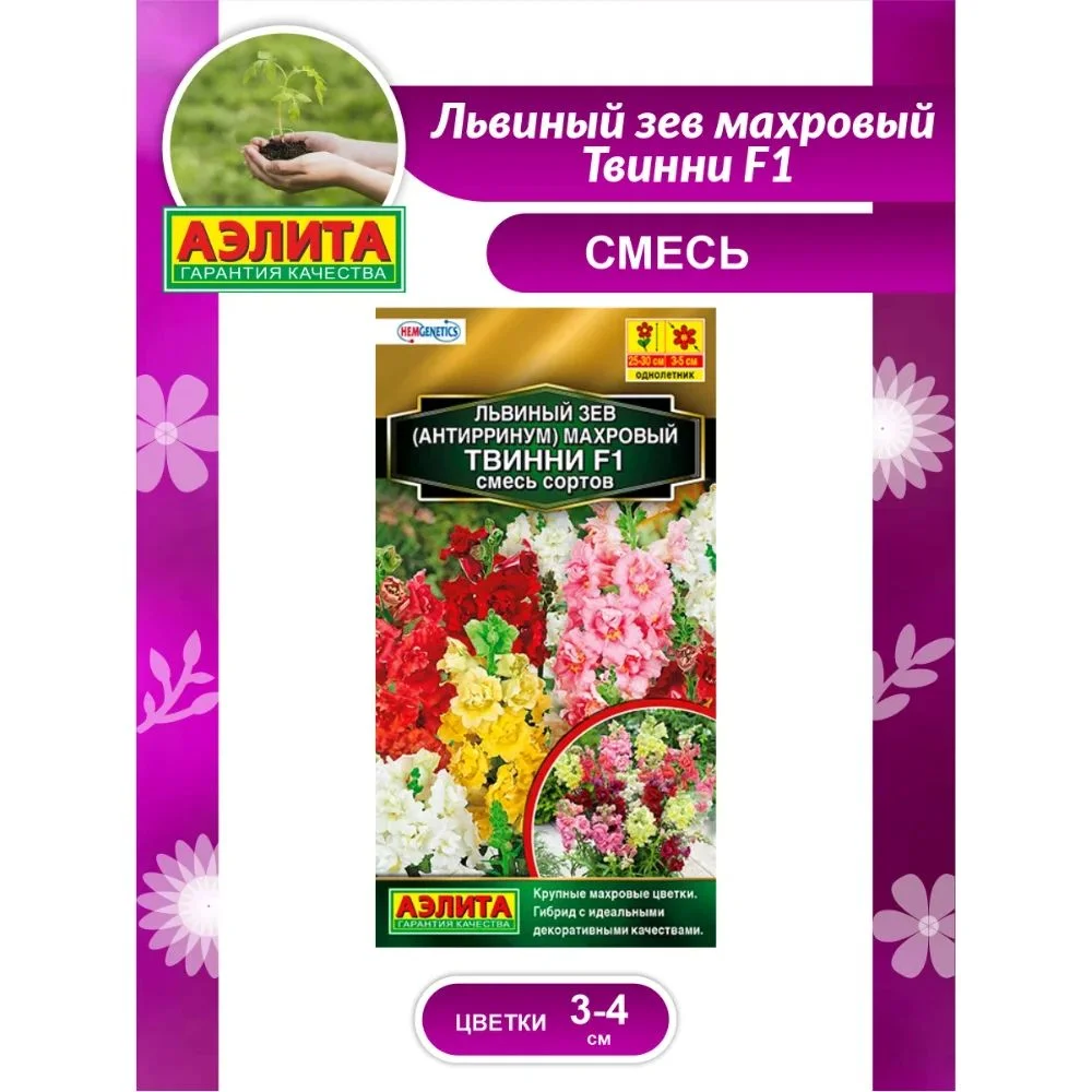 Первая на рынке серия махрового низкорослого львиного зева! Отличается крупными цветками Ø 3-5 см ярких красочных оттенков, которые собраны в плотные объемные кисти. Цветение раннее и продолжительное. Кус тики крепкие, с множеством боковых побегов, высотой 25-30 см. Растения не теряют своих декоративных качеств и в жаркое, и в дождливое лето. Обильноцветущая ароматная смесь украсит собой балконные контейнеры, уличные вазоны. Львиный зев можно использовать для срезки в составе великолепных букетов, надолго сохраняющих свежесть.